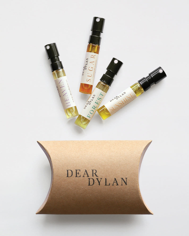 TRIAL FIRST! All Dear Dylan scents come with a small tester, so you can explore the scent before committing to it. We recommend dabbing on the front and back of both wrists, and smelling over a period of several hours. Different areas of skin can interact differently with scent, even from left to right side of the body. This will allow you to experience the top, middle, and base notes as they evaporate, to see if it's the right scent for you.